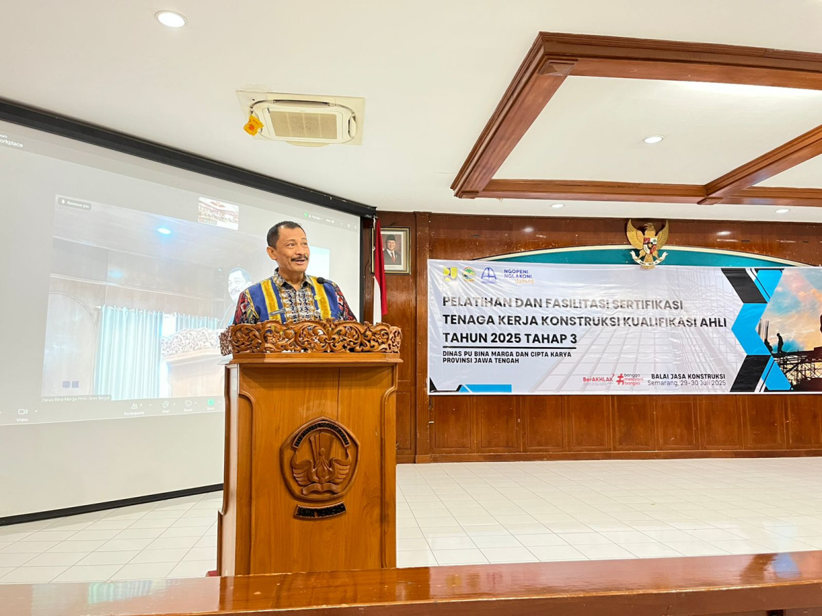 Kegiatan Pelatihan dan Fasilitasi Sertifikasi Tenaga Kerja Konstruksi Kualifikasi Ahli Tahun 2025 Tahap 3 ini dibuka oleh Kepala Dinas PU Bina Marga dan Cipta Karya Provinsi Jawa Tengah yang diwakili oleh Kepala Bidang Sarana dan Prasarana Permukiman dan Bangunan Gedung. Dalam sambutannya beliau menyampaikan harapannya bahwa dengan memastikan tenaga kerja memiliki kompetensi yang sesuai dan memiliki sertifikat kompetensi, diharapkan dapat membantu meningkatkan kualitas pekerjaan konstruksi dan berperan dalam memajukan industri konstruksi secara keseluruhan. Selain itu, beliau juga mengharapkan dengan penyelenggaraan kegiatan pelatihan dan fasilitasi sertifikasi ini dapat meningkatkan keandalan dan profesionalisme sehingga dapat membuka pintu untuk peluang karir yang lebih baik dalam industri konstruksi.