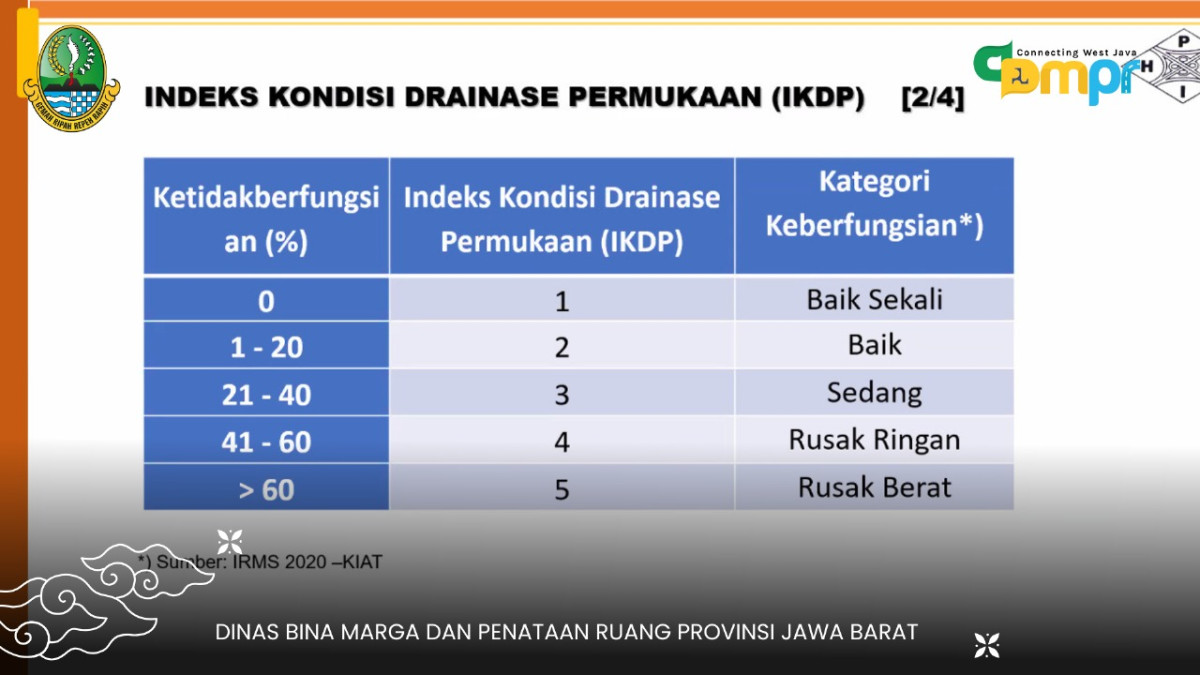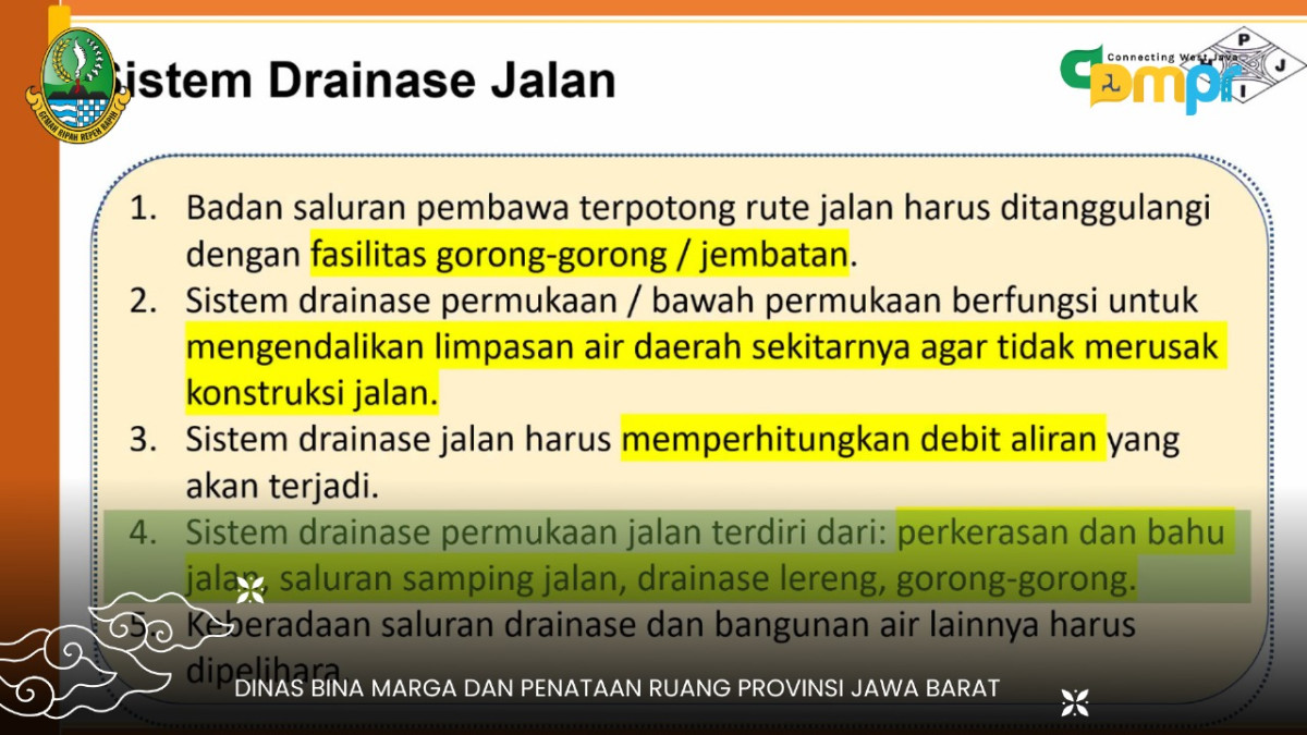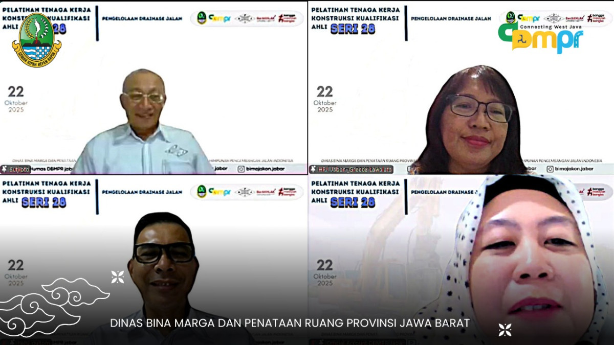Sehubungan dengan hal tersebut, Bidang Jasa Konstruksi Dinas Binamarga dan Penataan Ruang bekerjasama dengan Himpunan Pengembangan Jalan Indonesia (HPJI) mengadakan kegiatan Pelatihan Tenaga Kerja Konstruksi Kualifikasi Ahli Seri 28 dengan tema "Pengelolaan Drainase Jalan" , Rabu (22/10/2025) yang berlangsung secara daring dengan nara sumber Greece Maria Lawalata dari Direktorat Bina Teknik, Ditjen Bina Marga Kementerian PU dan Sucipto dari HPJI yang diikuti 500 lebih peserta masyarakat Jasa Kontruksi, LSP, Akademisi dan Perangkat Daerah.