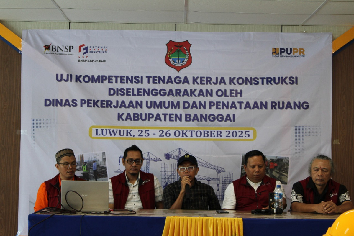 Dinas Pekerjaan Umum dan Penataan Ruang (PUPR) Kabupaten Banggai menyelenggarakan kegiatan Sertifikasi Tenaga Kerja Konstruksi untuk Kualifikasi Jabatan Operator serta Teknisi/Analis Jenjang 1 dan Jenjang 5 pada tanggal 25–26 Oktober 2025. Kegiatan ini berlangsung di aula kantor Dinas PUPR Kabupaten Banggai dan diikuti oleh puluhan tenaga kerja konstruksi dari berbagai bidang keterampilan.