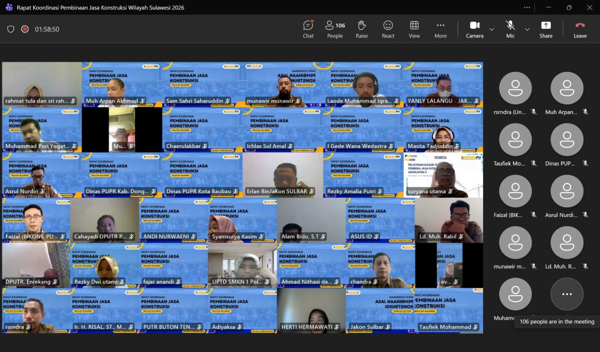Dinas Pekerjaan Umum dan Penataan Ruang (PUPR) Kabupaten Banggai mengikuti Rapat Koordinasi Penyelenggaraan Workshop Pembinaan Tenaga Kerja Konstruksi (TKK) Tahun 2026 Se-Sulawesi yang diselenggarakan oleh Balai Jasa Konstruksi Wilayah VI Makassar. Kegiatan tersebut dilaksanakan secara daring pada Selasa, 3 Februari 2026.