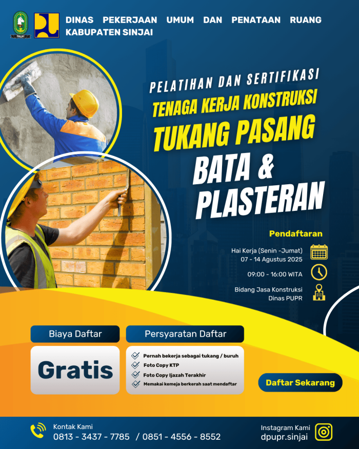 Pendaftaran Pelatihan dan Uji Sertifikasi Tenaga Kerja Konstruksi Tukang Bata dan Plasteran Tahun Anggaran 2025