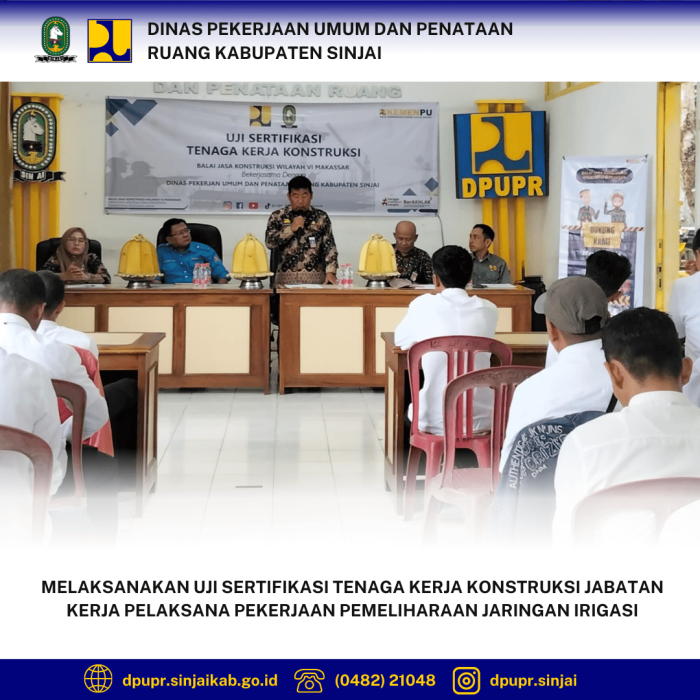 Dinas Pekerjaan Umum dan Penataan Ruang Kabupaten Sinjai bekerja sama dengan Balai Jasa Konstruksi Wilayah VI Makassar menyelenggarakan Pelatihan dan Uji Sertifikasi Tenaga Kerja Konstruksi jabatan kerja Tukang Batu / Plesteran dan Pelaksana Jaringan Irigasi. Kegiatan dilakukan pada 10 - 12 Septembe...